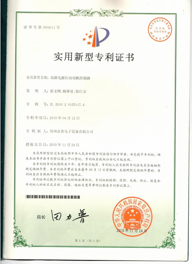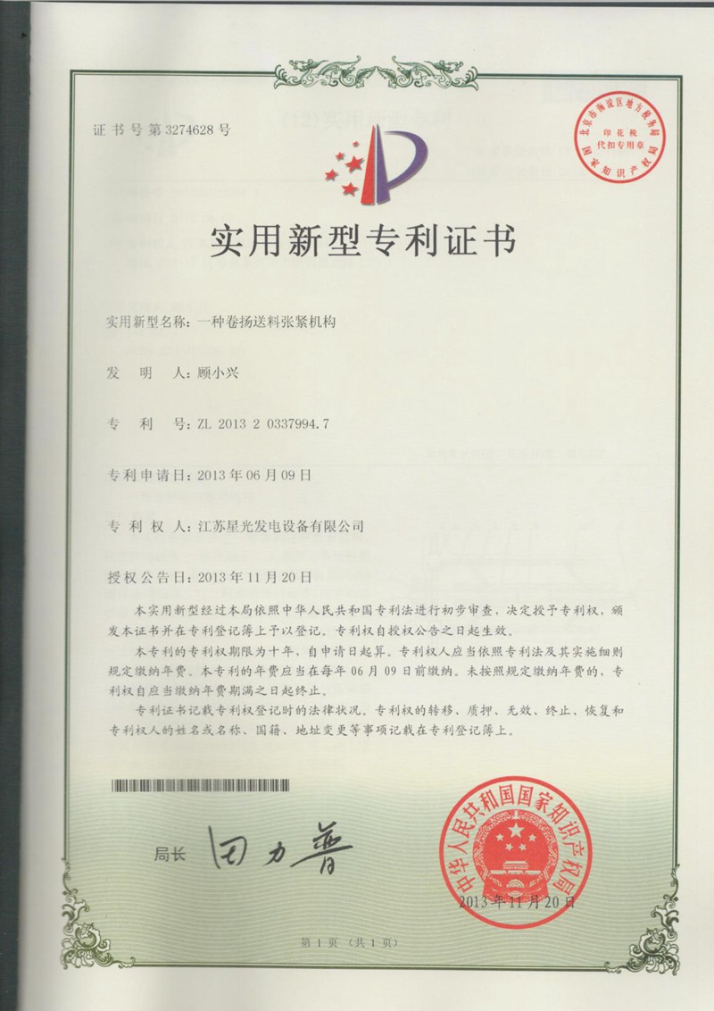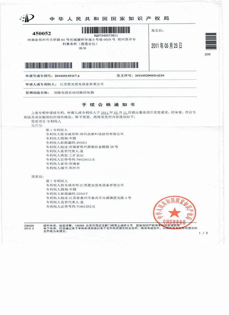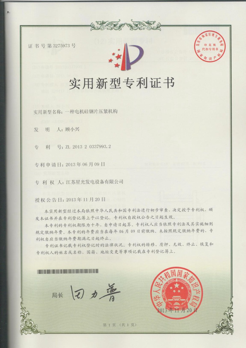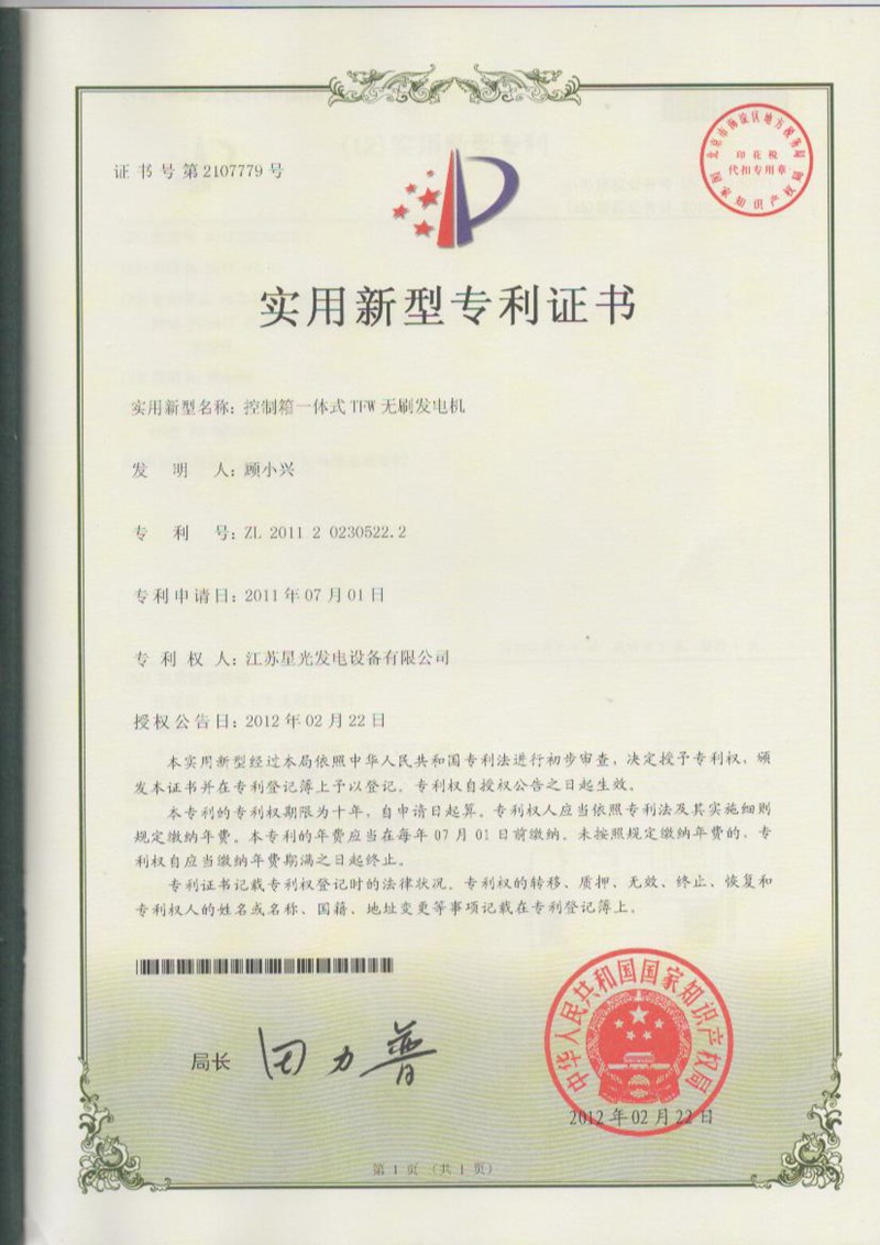 控制箱一體式TFW 無刷發(fā)電機-專利證書